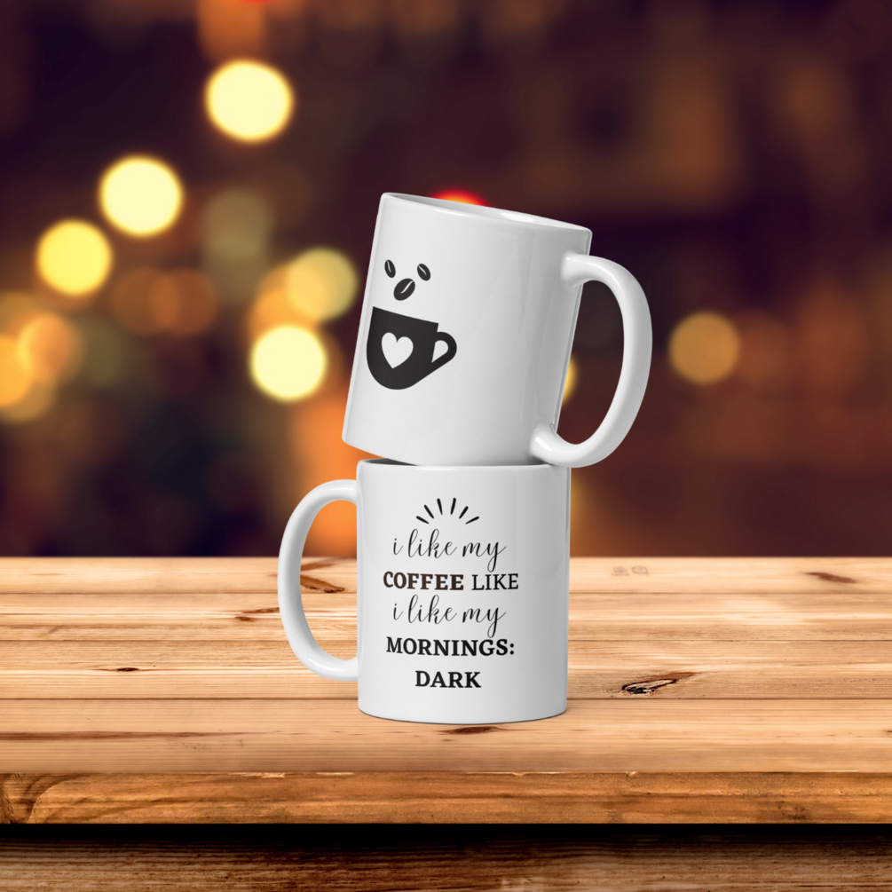 Introducing our "Dark Mornings, Bright Coffee" Mug, a stylish and robust addition to your daily caffeine ritual. Unveiling a unique design featuring a cute coffee cup on one side and the witty quote "I like my coffee like I like my mornings: dark" on the other, this mug offers a perfect blend of charm and functionality.