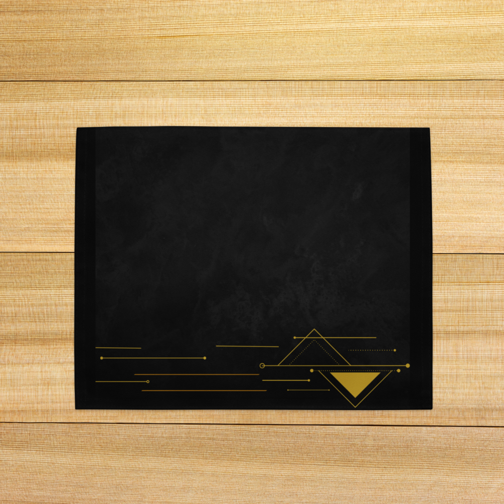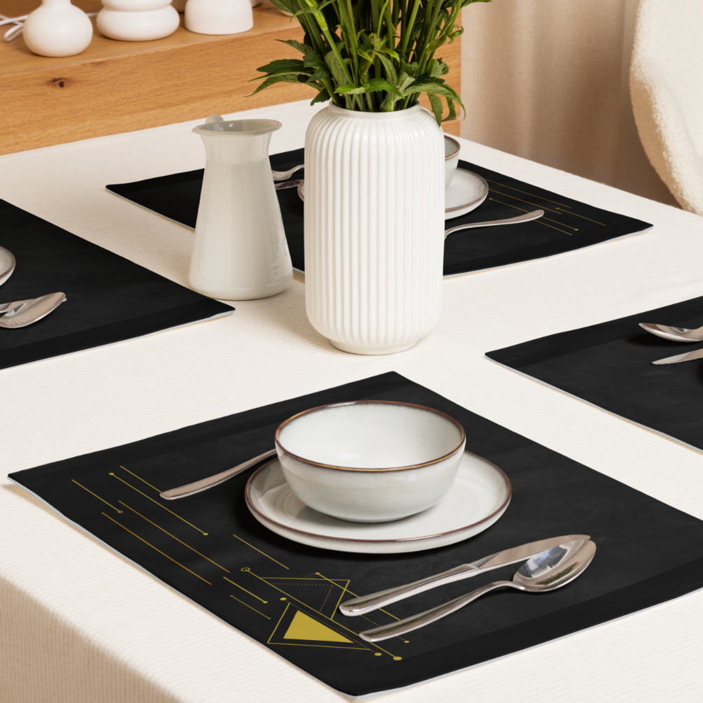 Ready to make a statement at your dining table? The customizable front allows you to express your individual style, transforming your dining space into a vibrant gallery of creativity. Featuring a captivating black and gold mixed geometric design on one side, these placemats exude opulence and modern elegance, making them suitable for various occasions.