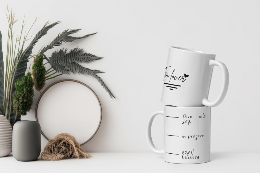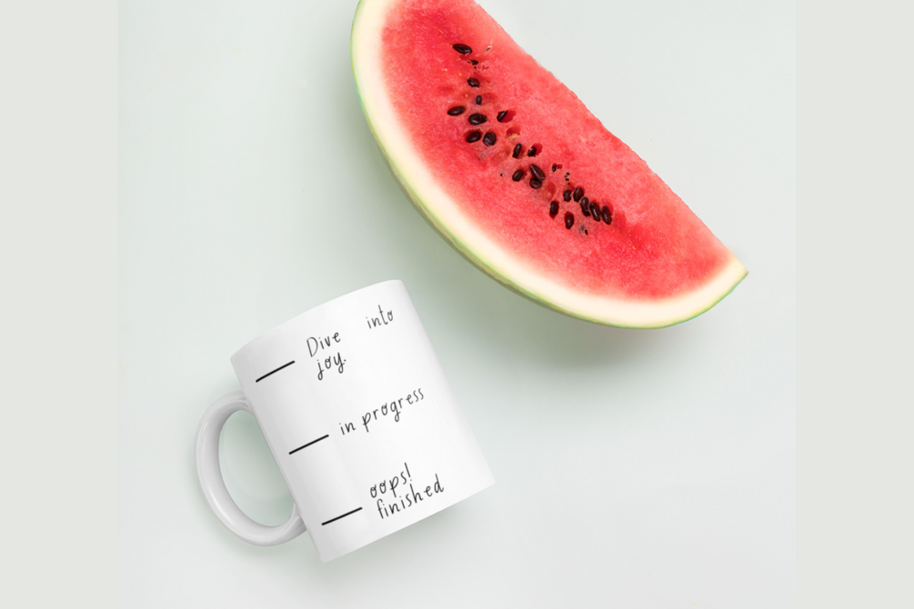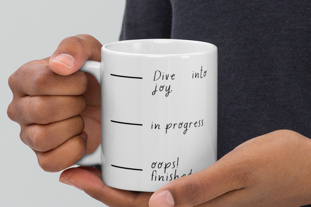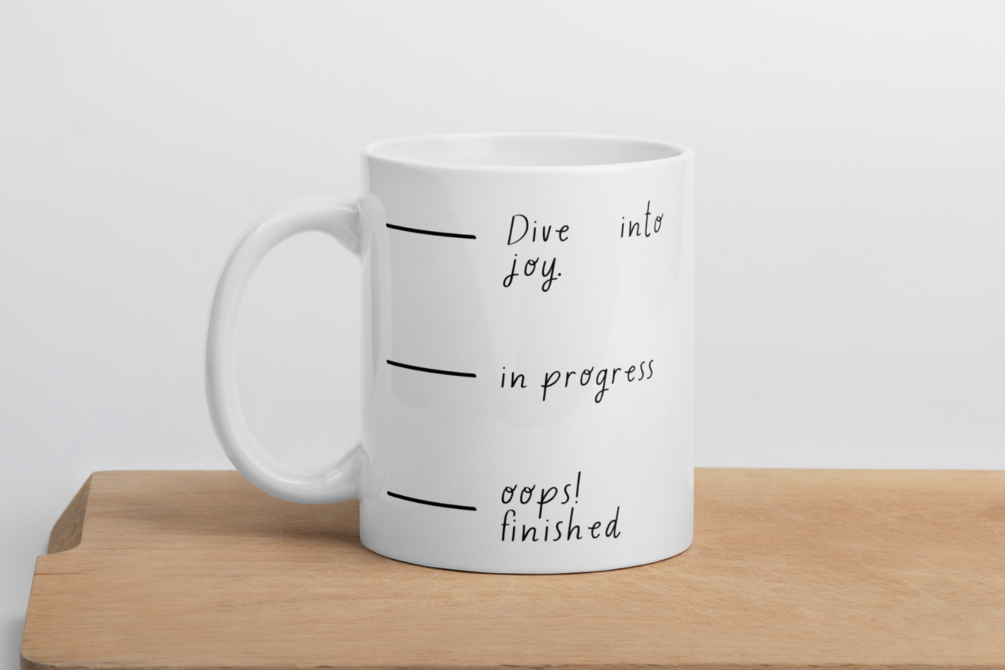 - Motivational Journey on the Reverse Side: Flip the mug, and you'll find three inspiring lines in varying heights – "Dive into Joy," "In Progress," and "Last Oops Finished." This dynamic design not only adds a touch of motivation to your day but also serves as a reminder that every creative journey has its unique stages.
